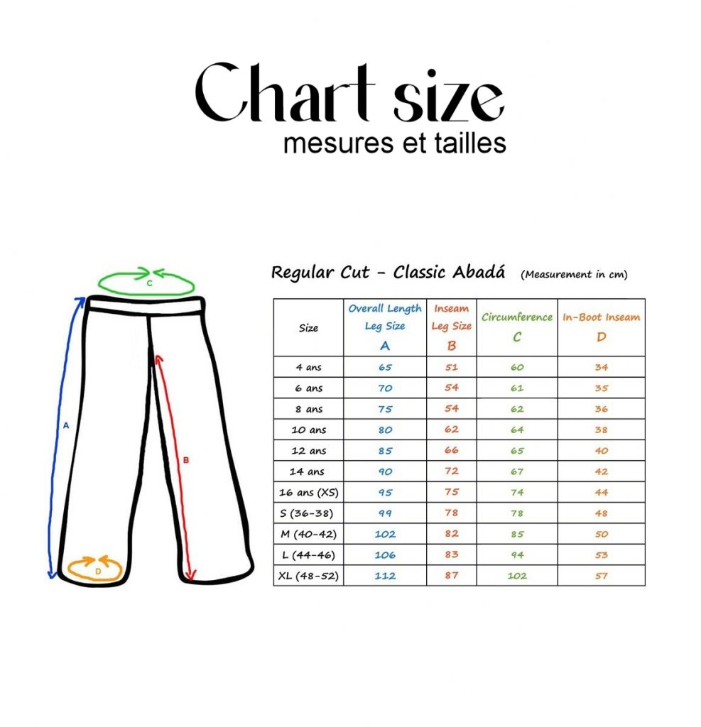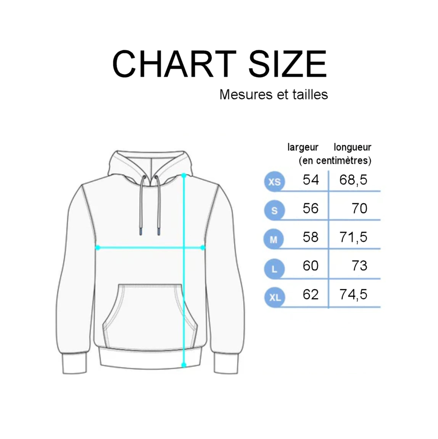 Pièces disponibles en taille enfant (4, 6, 8, 10, 12 ou 14 ans) ou adulte unisexe : XS, S, M, L et XL